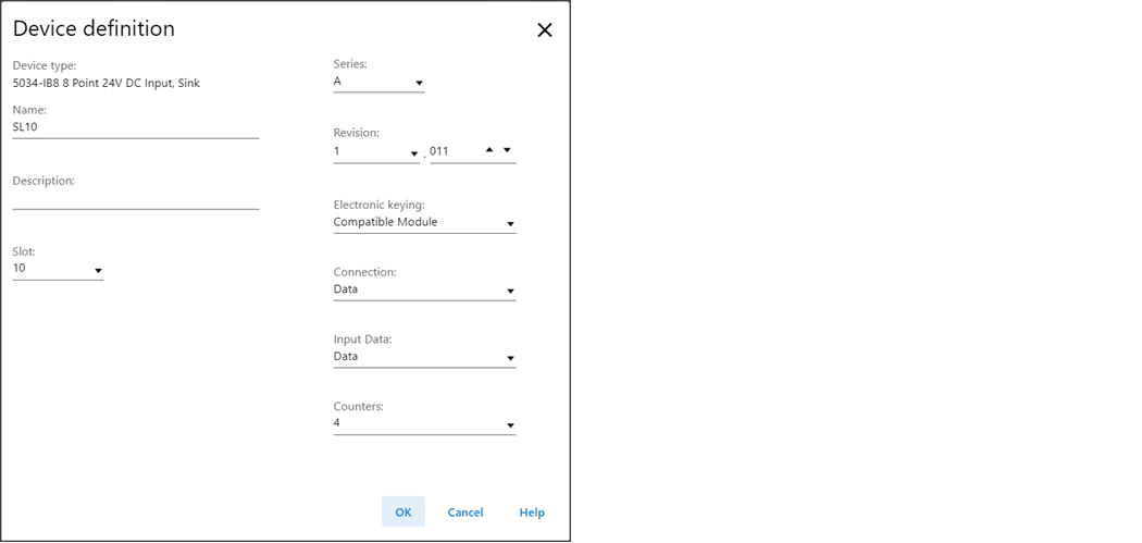 Slot | 指定设备所在的插槽编号。 根据平台的不同,I/O 设备的最大数量和 1 之间的插槽均有效。 创建设备时,插槽编号默认为第一个可用插槽位置。 当控制器更改为支持较小最大 I/O 计数的控制器时,当前插槽值可能不再有效。 | 1…32 |