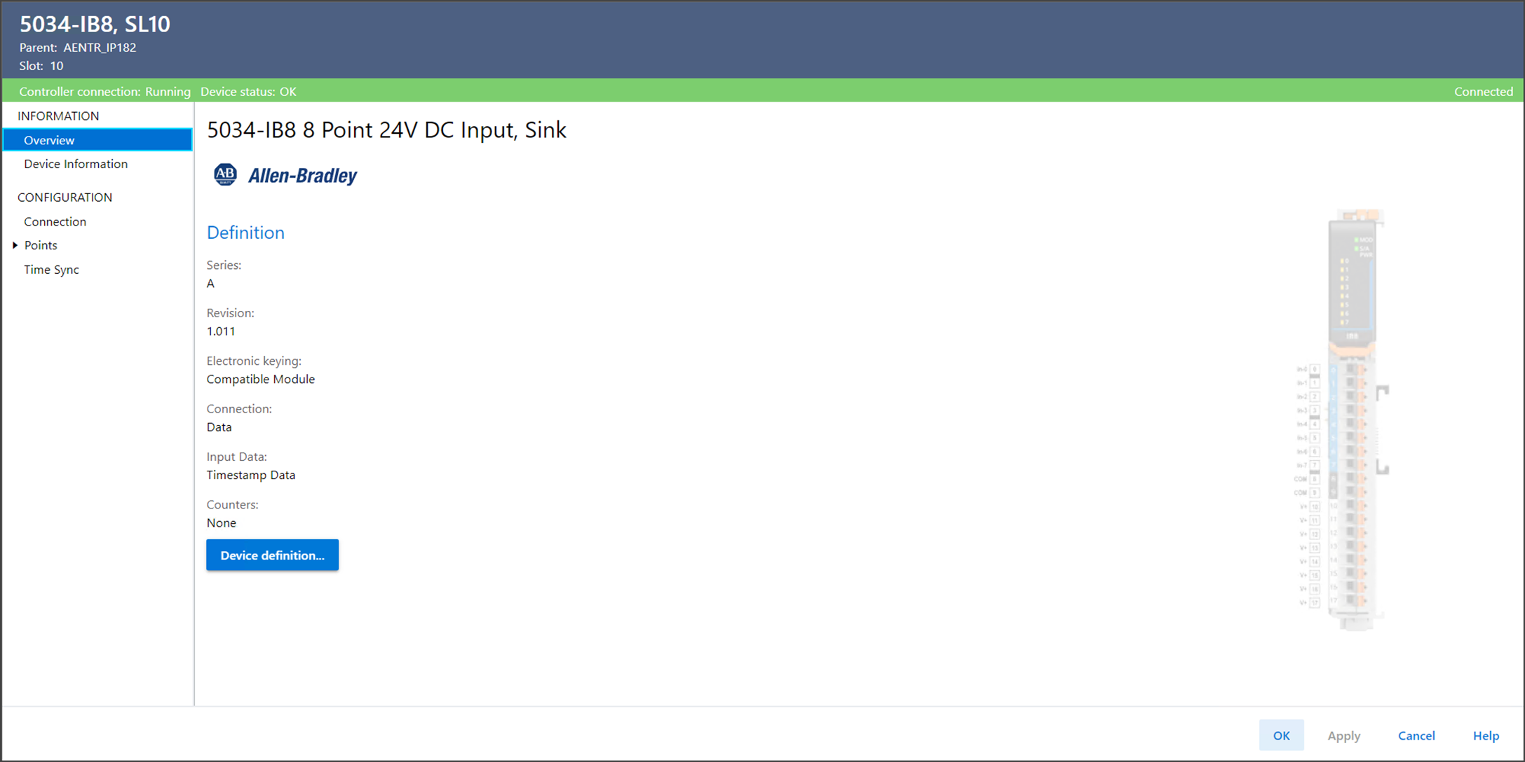 Connection | 指定设备和控制器之间传输的数据类型。 对于 Listen Only Data 选项,控制器和设备建立通信,控制器不向设备发送任何配置或输出数据。 建立完整的输入数据连接,但这取决于宿主控制器和设备之间的连接。 |
