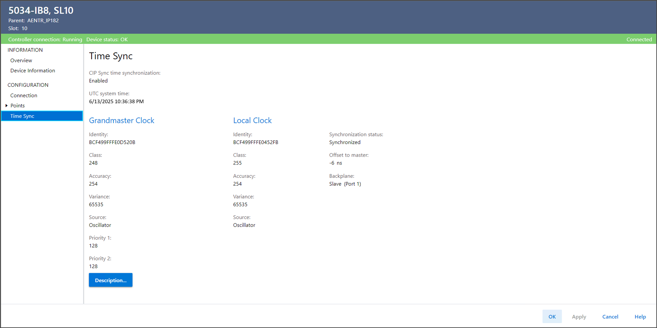 主时钟描述对话框提供有关主时钟的详细信息。 要查看主时钟描述,在 Time Sync 视图中选择 Description。