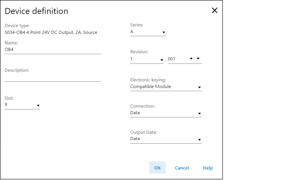Slot | 指定设备所在的插槽编号。 根据平台的不同,I/O 设备的最大数量和 1 之间的插槽均有效。 创建设备时,插槽编号默认为第一个可用插槽位置。 当控制器更改为支持较小最大 I/O 计数的控制器时,当前插槽值可能不再有效。 | 1…32 |