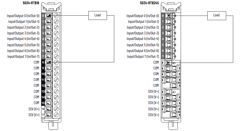 要建立更多的 COM/V+ 连接,尤其是在混合输入/输出配置下,请使用 5034-RTB24S,或在??榕员甙沧?5034-MBPTM 或
