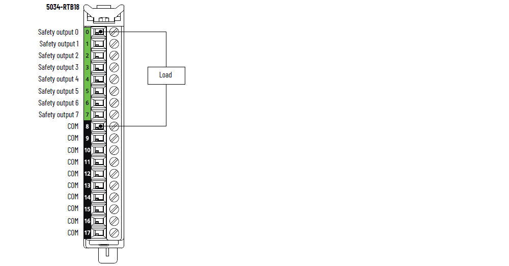 有关可用于功能安全应用的 5034-OB8S 和 5034-OB8SXT 接线图的更多示例,请参见 PointMax 数字量 I/O 模块用户手册(出版物:5034-UM002)。 接线配置影响适用于 PointMax 安全 I/O