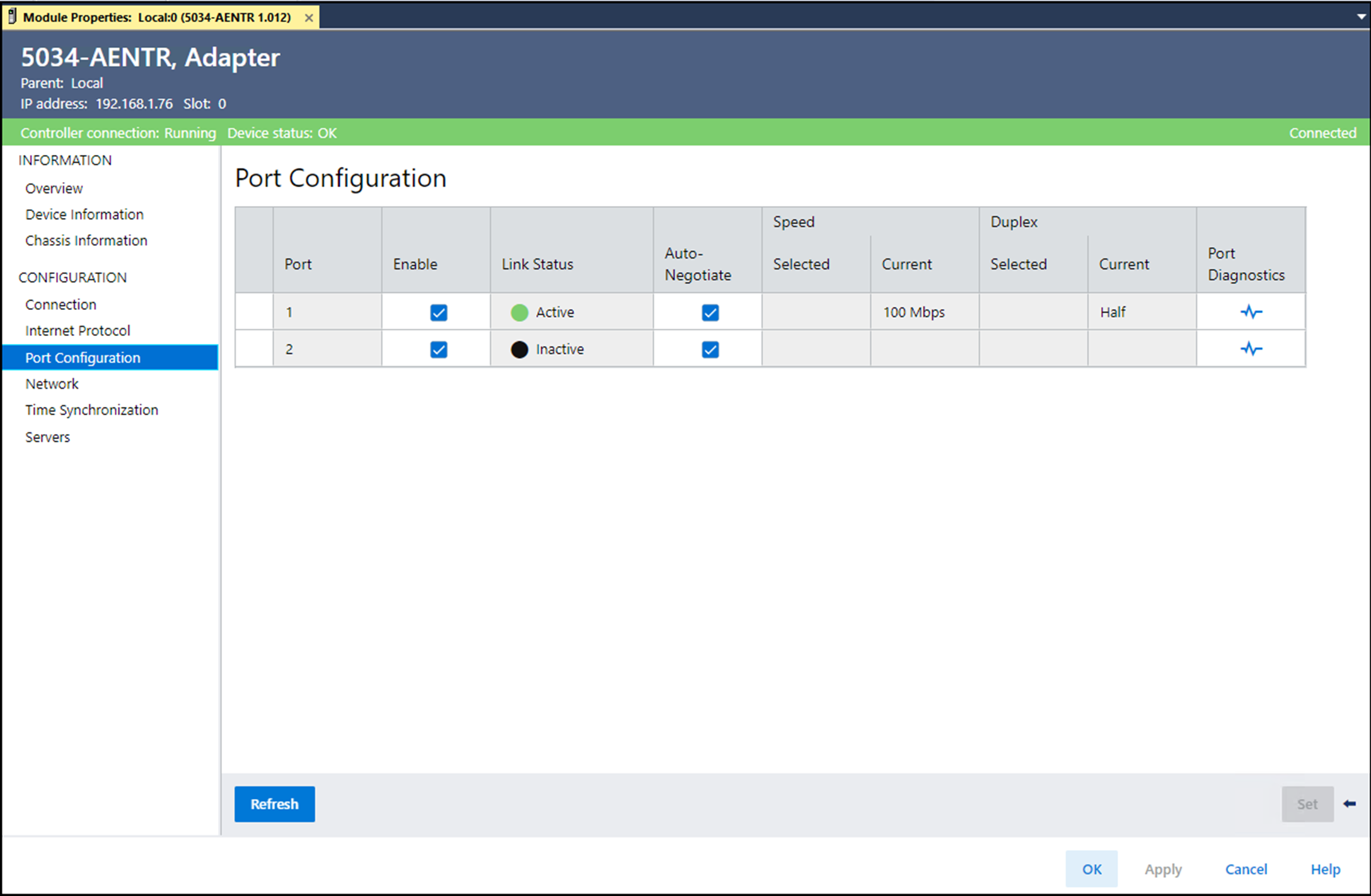- 从 Device Information 视图中,选择 Port Configuration。期望任务动作由模块自动设置端口速度和双工设置。保持 Auto-Negotiate 复选框处于选中状态。手动配置端口速度和双工设置。按以下步骤操作。