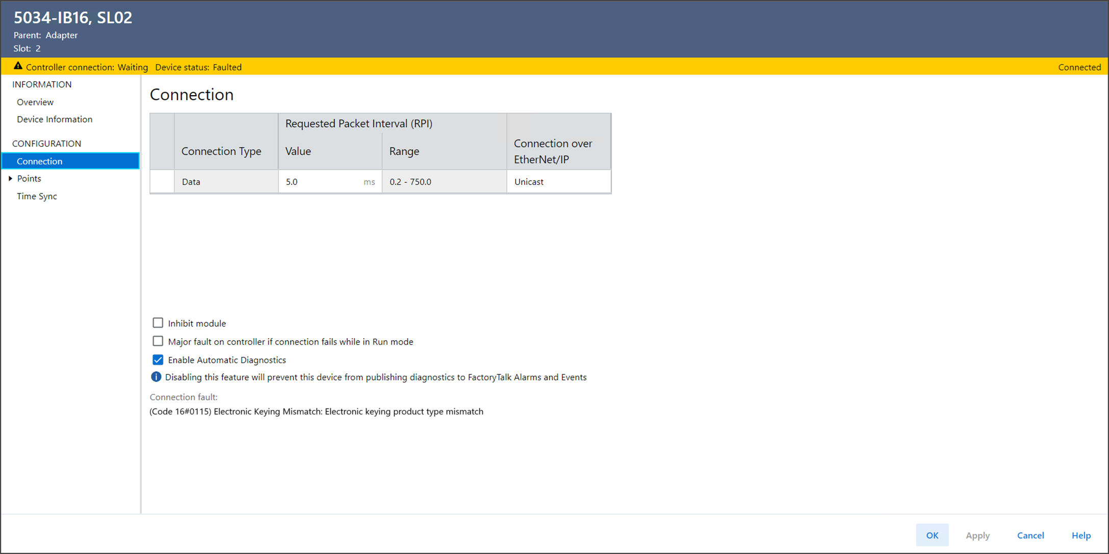 匹配错误 | 转到 Device Information 视图,确认物理??榧嫒莼蚱ヅ渑渲帽晔?。 有关更多详细信息,请参见 Electronic Keying in Logix 5000 Control Systems